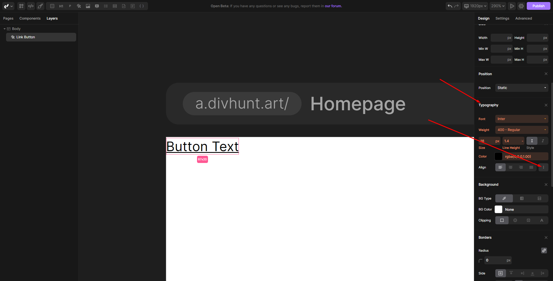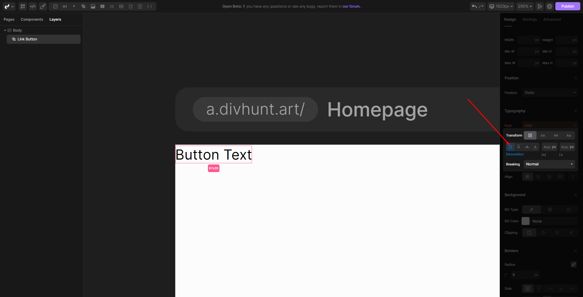 Under the Typography section in the designer, click on three dots for more options.