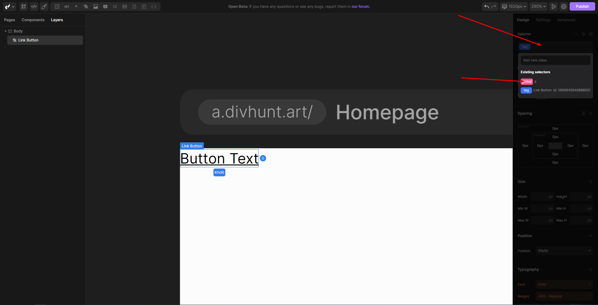 Select the link button, navigate to the Selector area, and select “Global”