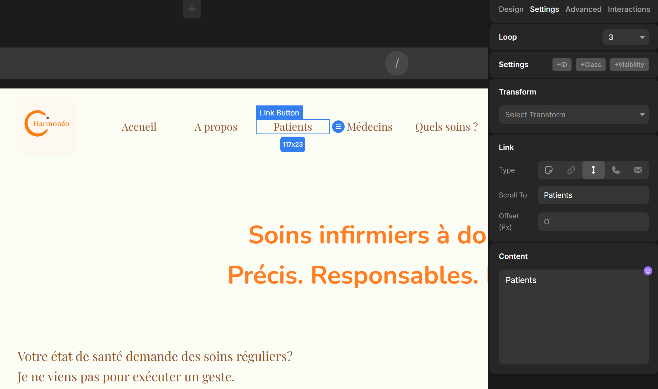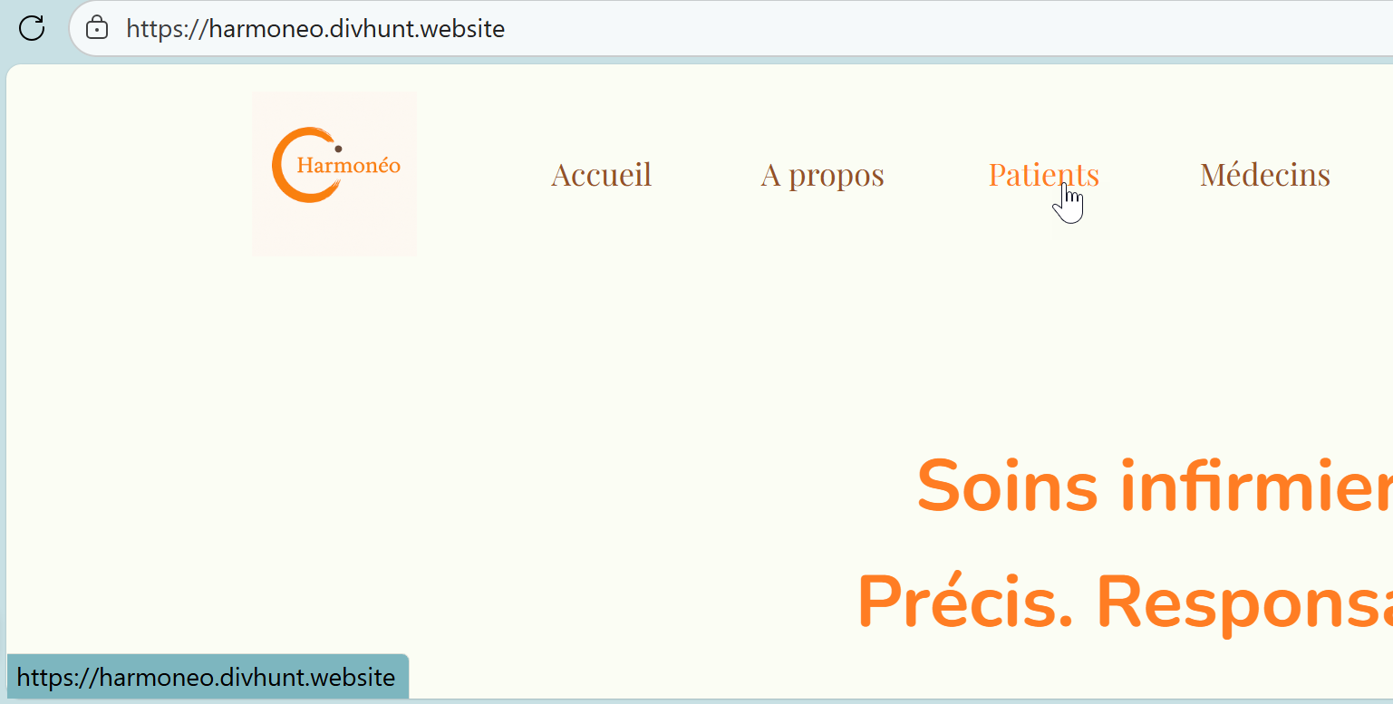 I also tried to replace the link towards anchor by link to url with hash and ID, but it does not work either, although the direct access to the link does work : https://harmoneo.divhunt(dot)website/#Patients